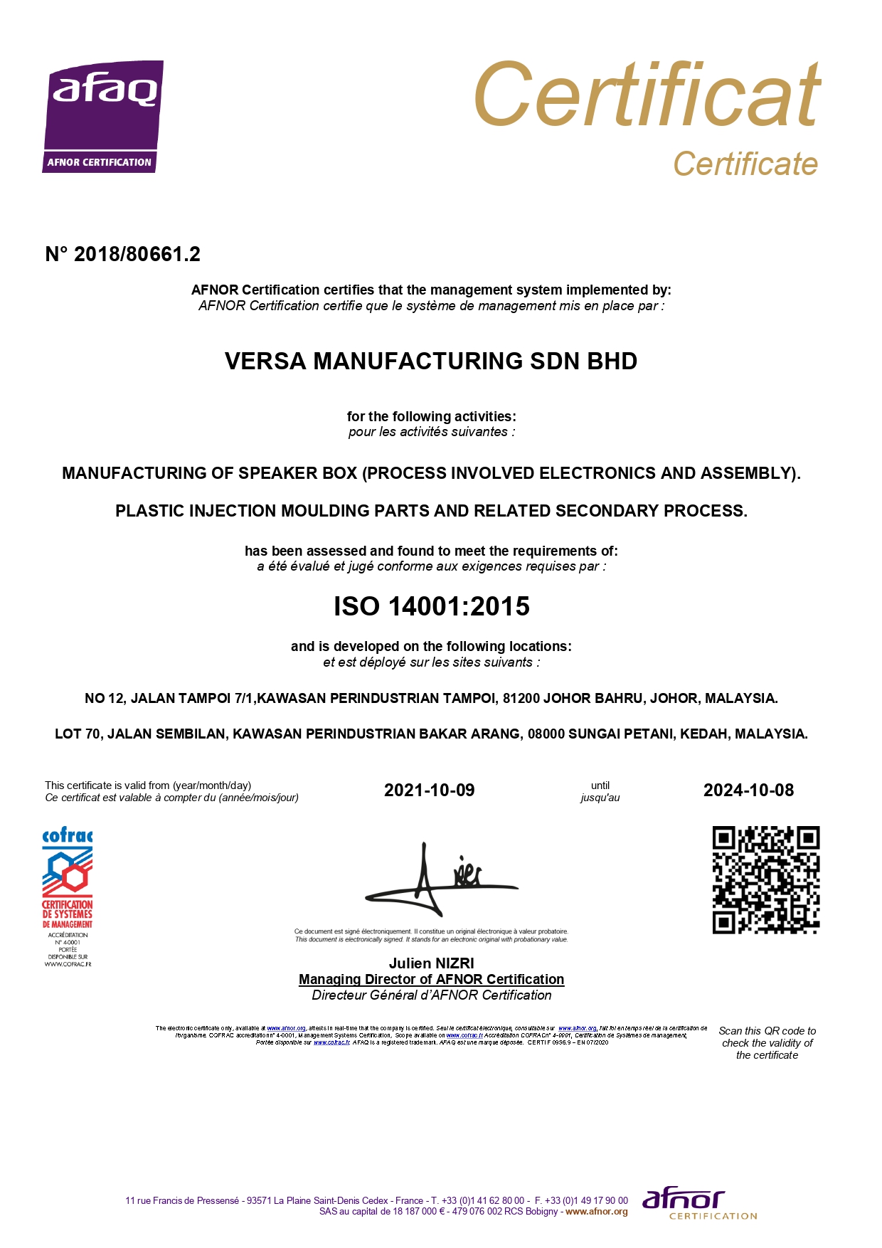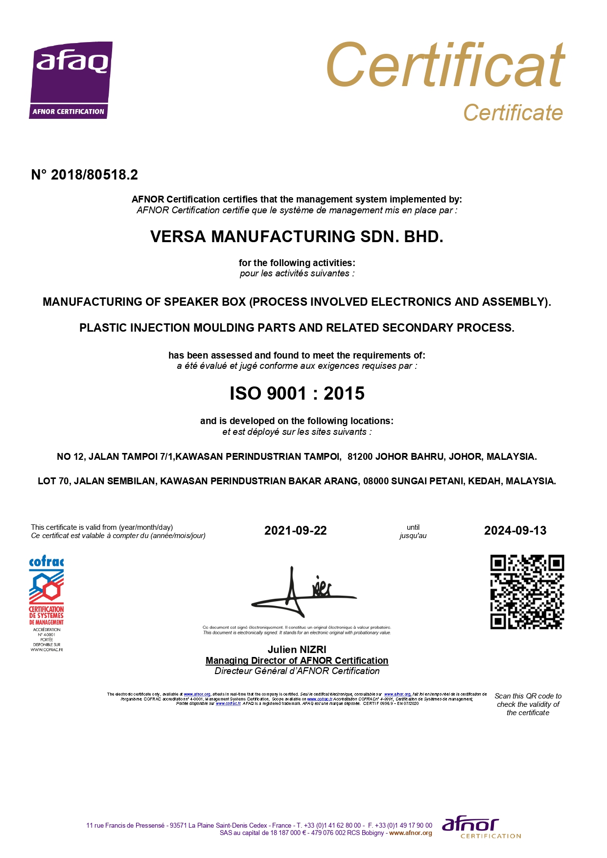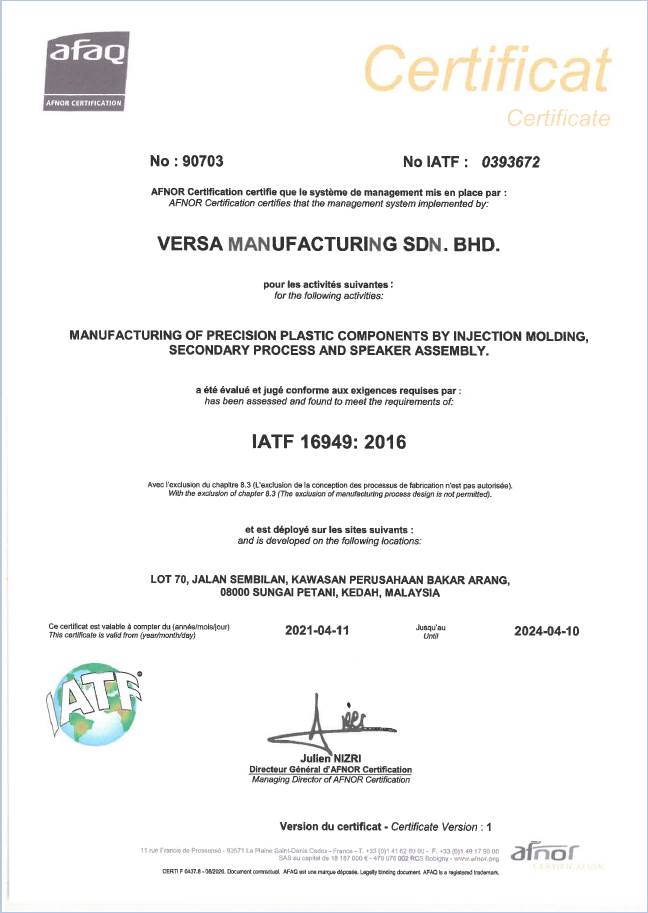 Certificate of Manufacturing of Precision Plastic components by injection moulding, secondary process and speaker assembly.