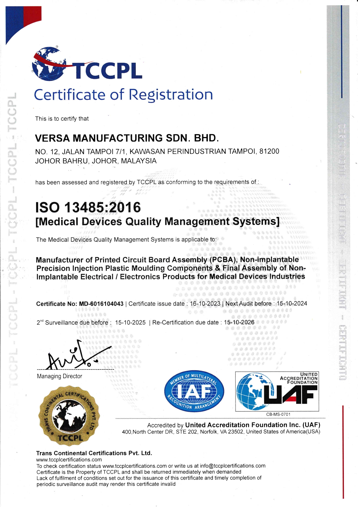 Certificate of Manufacturing of Printed Circuit Board assembly (PCBA), non-Implantable precision injection plastic moulding components and final assembly of non-Implantable electrical / electronics products for medical devices industries.